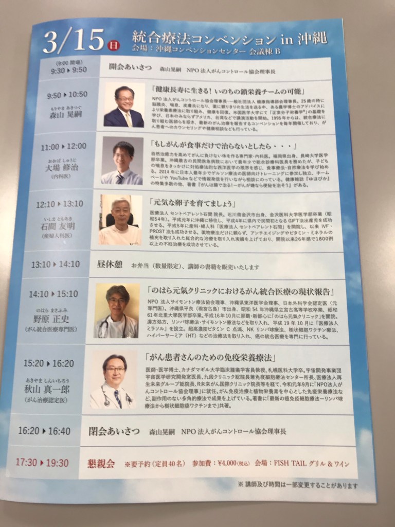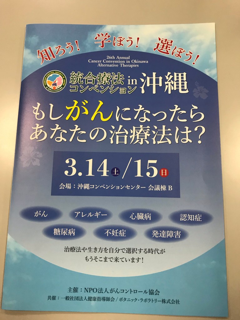 日本がんコンベンションは毎年一回開催されていて、今年は26回目になります。私は毎年ボランティアスタッフでお手伝いをさせていただいております。今年は初めて、沖縄で開催されます。3月14日(土)15日(日)です。お知り合いの方が沖縄方面にいらっしゃいましたら、お知らせしていただけたら幸いです。よろしくお願い致します。