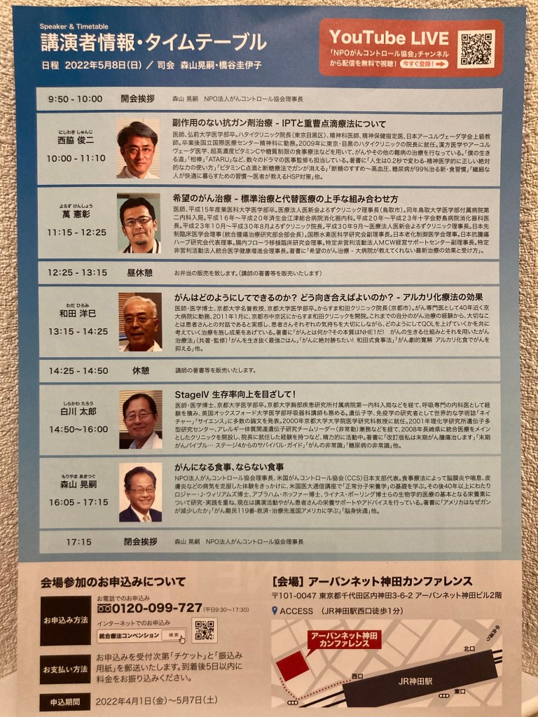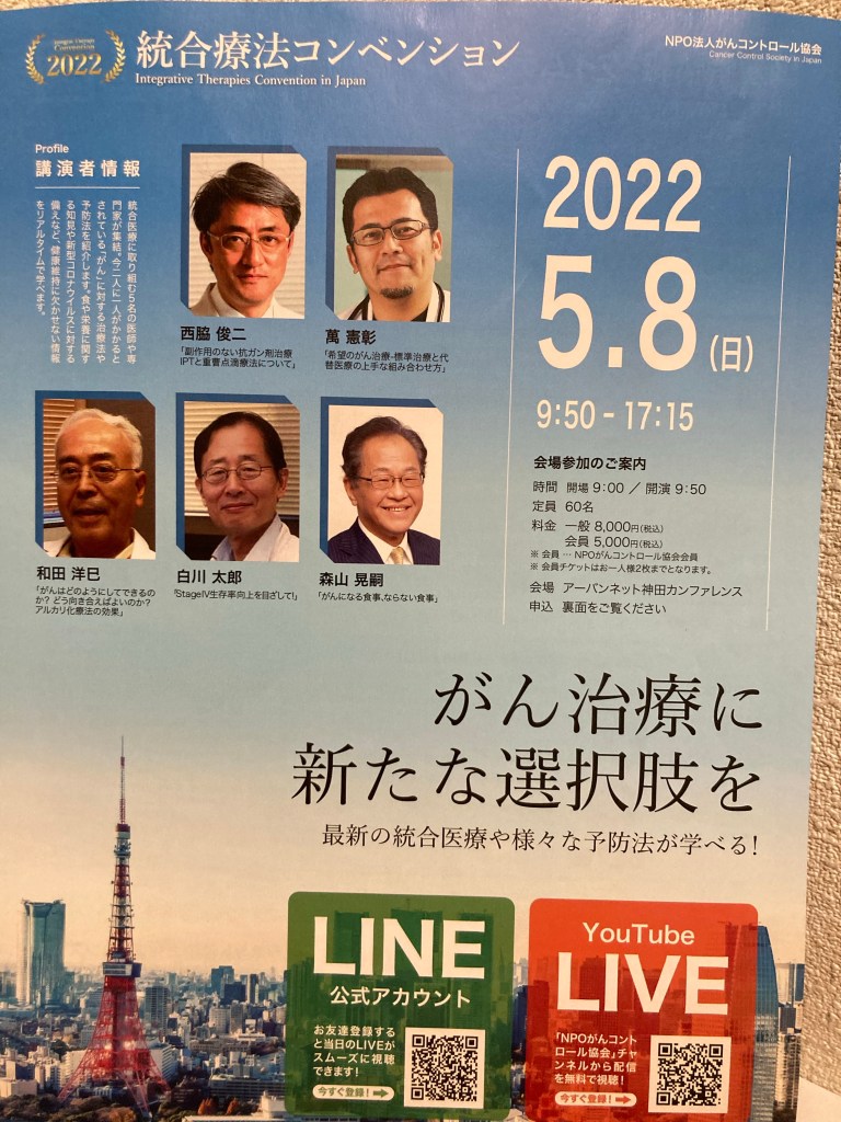 私の母は22年前に乳がんになりました。手術、抗がん剤、放射線治療をしましたが、がんとわかってから1年後に天国に逝きました。当時、母も私達家族も、統合療法の事を知りませんでした。がんの治療に選択肢がある事を、多くの方々に知ってほしいと思っています。