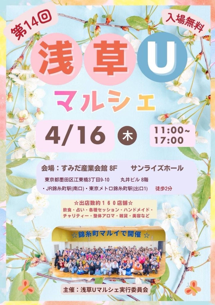 2026.4.16 浅草マルシェ 投稿日: 2026年4月13日 投稿者: てあてる 2026年4月16日(木)11:00〜17:00マルシェに出店します。会場は、JR錦糸町駅前丸井8階 すみだ産業会館です。私は温熱+足もみを、20分で体験していただきます。施術ブース以外にも、飲食店、占い、手作りアクセサリー等約170店舗出店します。あなたのお気に入りが見つかるかも?どうぞ気軽に遊びにいらして下さいね〜。興味を持たれた方は、個人メッセージをください。ただいま、足もみブースの事前予約を受付中です。